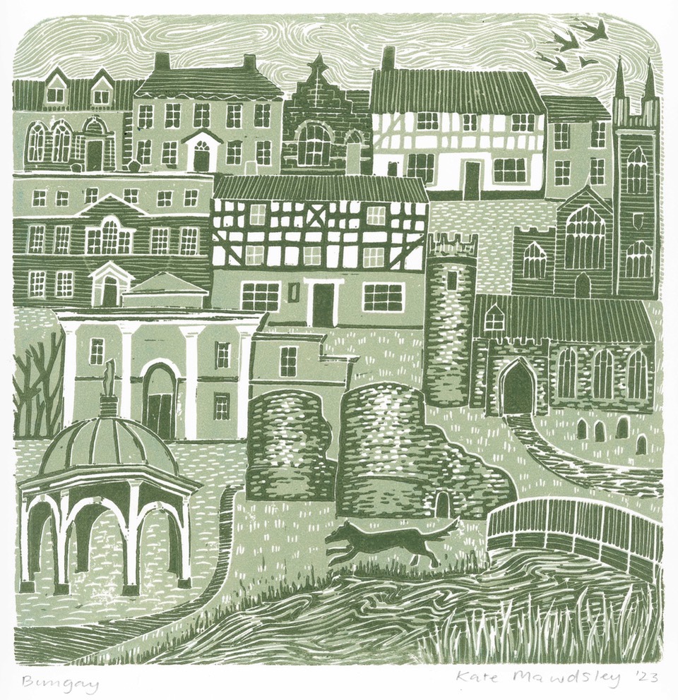 The major buildings which make up this pretty town in Suffolk. Printed on Somerset paper using oil based inks.